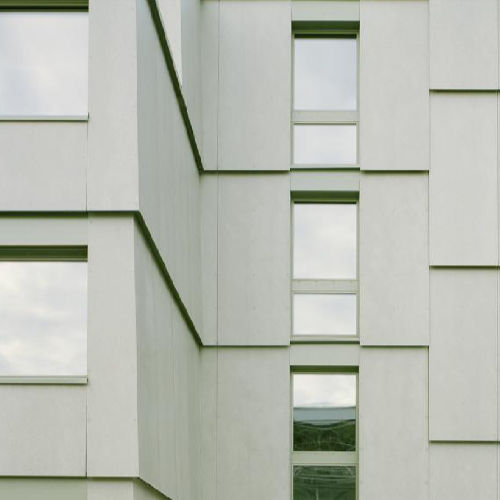 Die Fassaden von Dalton erinnern abstrakt an die leichten Vorhangfassaden des abgängigen Bestandsgebäudes. Sie erhalten ebenfalls eine vorgehängte Fassade, allerdings aus farbigen Paneelen. Diese sind in einem sanften Neigungswinkel montiert, es entsteht ein leichtes Schatten- und Lichtspiel auf den konstruktiv einfach gehaltenen Fassaden. Das Dach wird konstruktiv als Flachdach konzipiert und wird ebenfalls in einem leichten Winkel ausformuliert. Die Gebäude erhalten dadurch einen zum Fassadenbild passenden Dachabschluss, als Nebeneffekt wird die Belichtung tiefer liegender Grundrissbereiche ermöglicht.